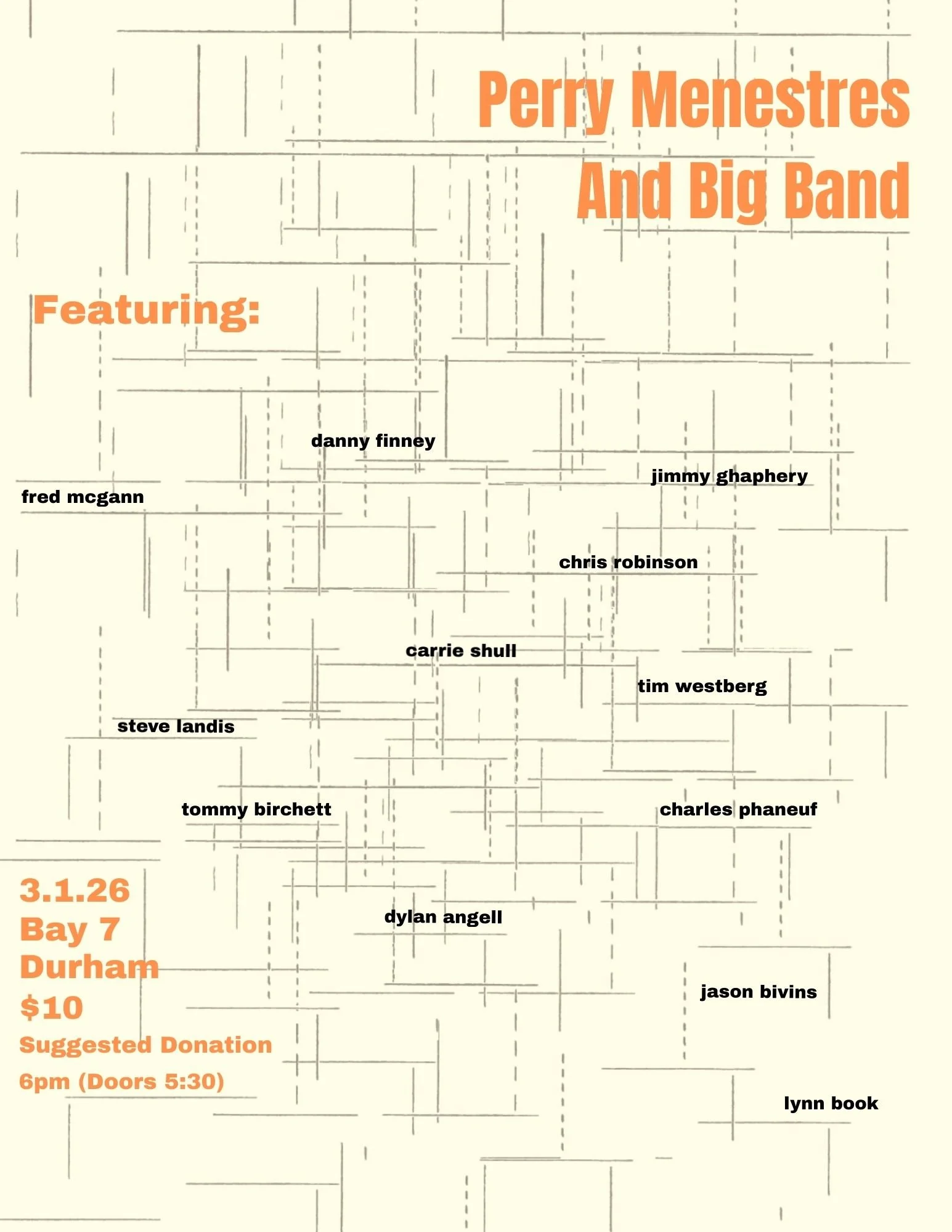 David Menestres and Jordan Perry are instrumentalists/ composers/improvisers loosely located in the mid atlantic. Their paths have been colliding for several years through various shared bills and social engagements. In their first performed collaboration, Perry and Menestres will cull artists with whom they've individually worked over the years to sonically survey the space of Bay 7.